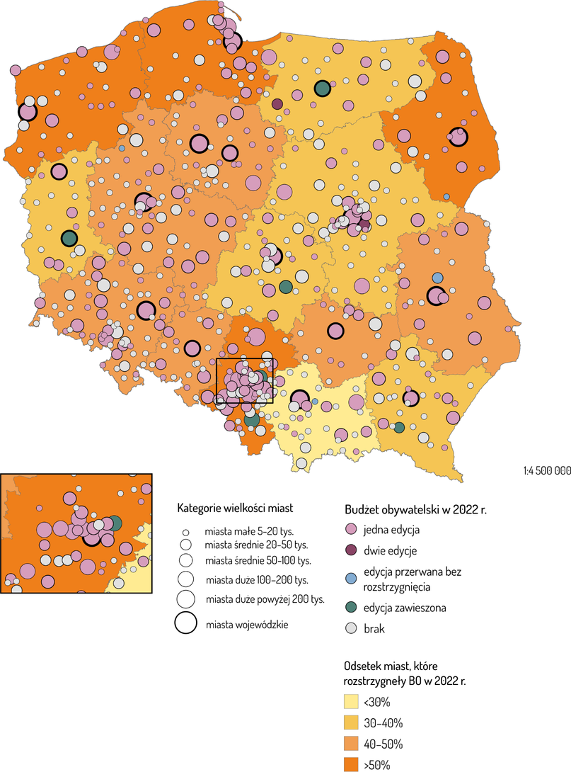 Ryc. 4. Występowanie budżetu obywatelskiego w 2022 r. Objaśnienia: N=575 miast; warunkiem przypisania edycji BO do 2022 r. było rozpoczęcie głosowania w okresie 1.01–31.12.2022 r., nawet jeśli nabór wniosków rozpoczął się w roku poprzedzającym – za edycję „przerwaną bez rozstrzygnięcia” uznano każdy proces, który zakończył się bez wyłonienia projektów do realizacji. „Edycja zawieszona” – zob. art. 112 Ustawy z dnia 12 marca 2022 r. o pomocy obywatelom Ukrainy w związku z konfliktem zbrojnym na terytorium tego państwa. Źródło: badania Obserwatorium Polityki Miejskiej IRMiR