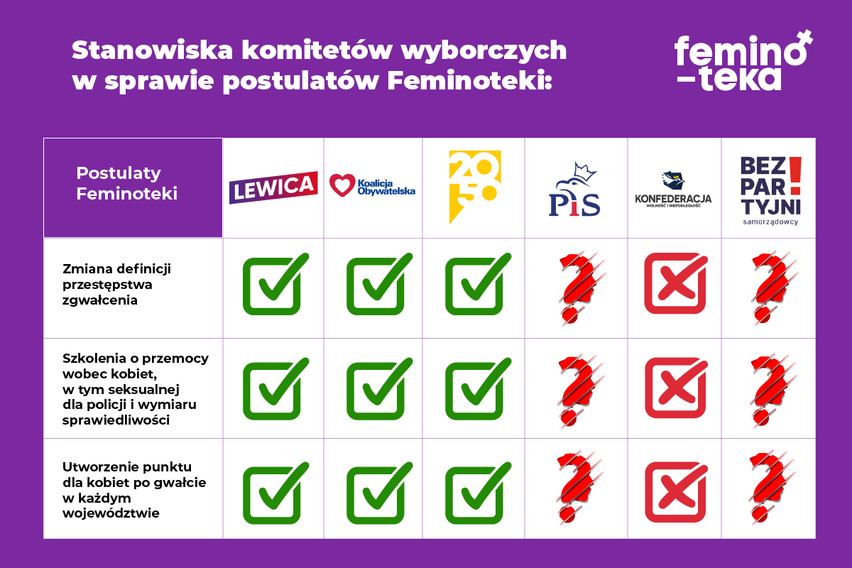 Fundacja Feminoteka otworzyła w czerwcu 2023 roku w Warszawie pierwszy w Polsce Punkt pomocy dla kobiet po doświadczeniu gwałtu. Takie ośrodki działają w krajach europejskich od ponad 40 lat. Osoby zgłaszające przemoc seksualną mają dostęp do kompleksowej i fachowej pomocy w miejscu nieodległym od swojego miejsca zamieszkania. W trzecim pytaniu zapytałyśmy, czy dane ugrupowanie doprowadzi do utworzenia takich punktów w każdym województwie.