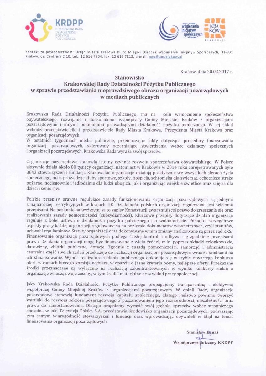 Krakowska Rada Działalności Pożytku Publicznego przyjęła stanowisko w sprawie przedstawiania nieprawdziwego obrazu organizacji pozarządowych w mediach publicznych.