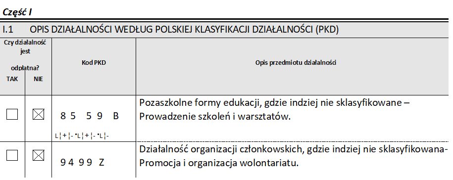 Przy każdym kodzie PKD w formularzu KRS-W-OPP zaznaczamy, czy ten konkretny rodzaj działalności jest nieodpłatny czy odpłatny. Jeśli jest taki i taki (tak może być), trzeba go powtórzyć, czyli wpisać jeszcze raz i zaznaczyć drugą opcję (za pierwszym razem, że jest odpłatny, a za drugim – nieodpłatny; lub odwrotnie).