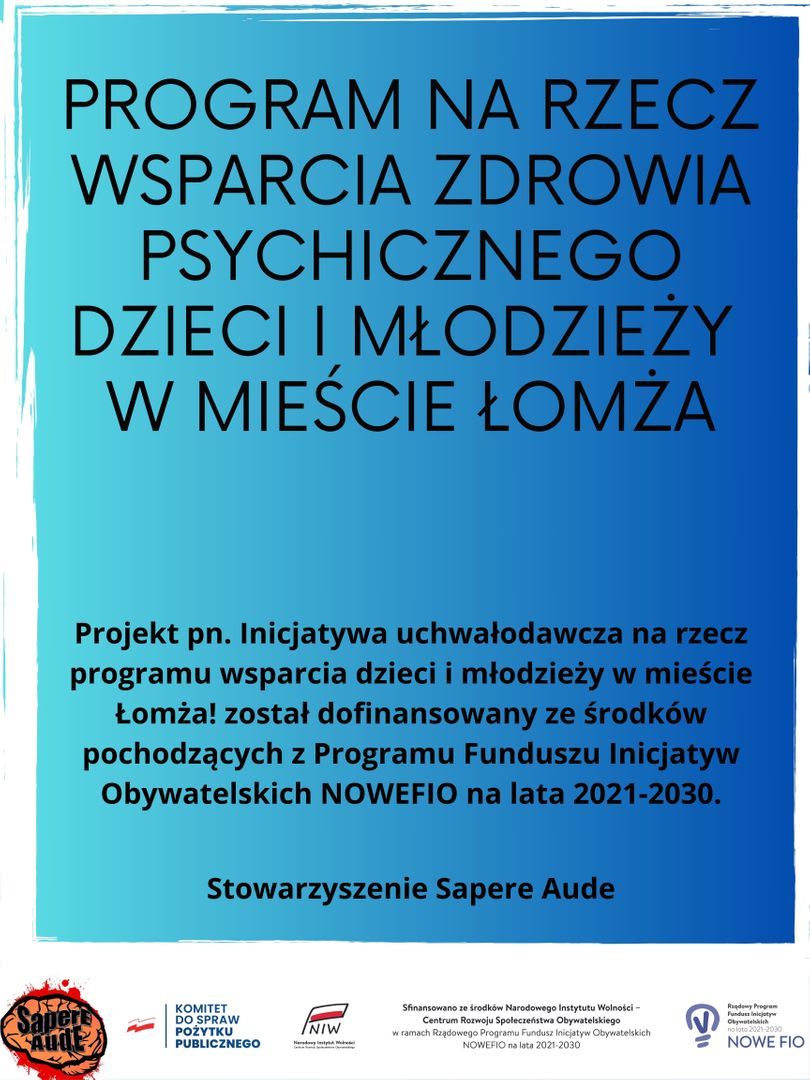 Projekt pn. Inicjatywa uchwałodawcza na rzecz programu wsparcia dzieci i młodzieży w mieście Łomża! został dofinansowany ze środków pochodzących z Programu Funduszu Inicjatyw Obywatelskich NOWEFIO na lata 2021-2030.