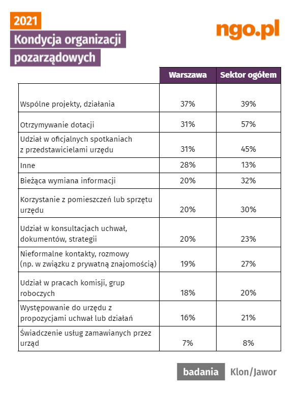 Lokalny samorząd gminy lub miasta jest dla organizacji w Polsce trzecim najważniejszym partnerem i 81% sektora deklaruje z nim współpracę, z czego 25% organizacji deklaruje, że ma regularne kontakty z samorządem. W Warszawie relacje z lokalnym samorządem są dużo rzadsze i mniej intensywne, gdyż 52% fundacji i stowarzyszeń ze stolicy utrzymuje jakiekolwiek kontakty z lokalnymi jednostkami samorządu, a tylko dla 7% są one częste. Najczęściej wymienianym powodem braku współpracy z warszawskim urzędem jest niepokrywanie się działań organizacji z zadaniami administracji (tak deklaruje 44% organizacji, które nie współpracują z samorządem). Część organizacji uważa również, że nie mają szans na takie kontakty w konkurencji z innymi podmiotami.