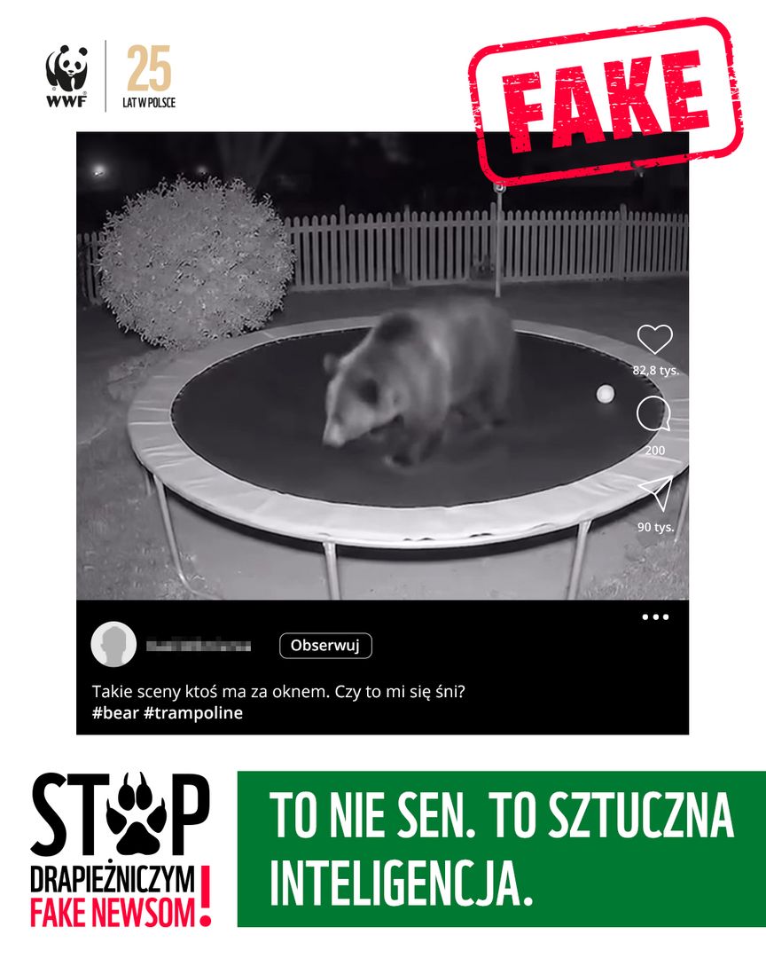 "Ostatnio częściej mamy do czynienia z dezinformacją w social mediach, gdzie liczy się łatwy zysk (lajki i udostępnienia), a wygenerowanie filmu z pomocą AI, na którym na przykład niedźwiedź walczy z kotem, a wszystkiemu przygląda się dziecko, przyniesie twórcy takiej mistyfikacji wirtualną fortunę" – komentuje Piotr Kalata, starszy specjalista ds. komunikacji Fundacji WWF Polska.