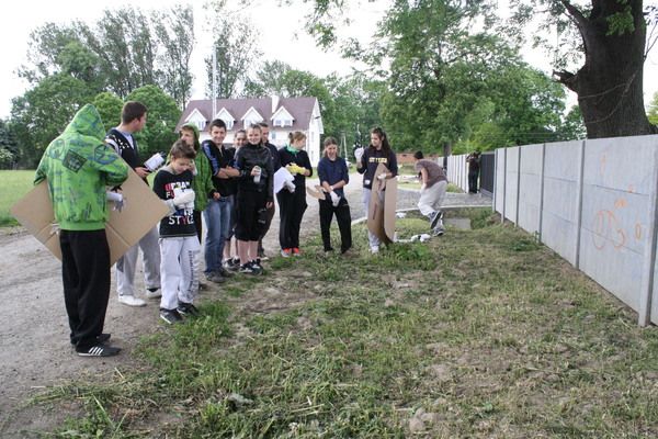 „W ramach projektu zorganizowaliśmy w Samborcu akcję: wielkie malowanie muru, czyli ekspresja koloru na betonie. To był przełomowy moment w naszym projekcie. Pokazaliśmy innym oraz samym sobie, ze jesteśmy grupą, która potrafi ze sobą współgrać, współpracować i w pełni angażować się dla wspólnego dzieła. Było wspaniale! Malowaliśmy cały dzień, przez 8 godzin. Pogoda nam sprzyjała. Ani jedna kropla deszczu nie spadła na nasze malowidła. Robione przez nas szablony sprawdziły się w stu procentach, ale i tak nasza wyobraźnia i kreatywność przekroczyła kartonowe projekty. Kolorowe malowidła zaczęły żyć własnym życiem.