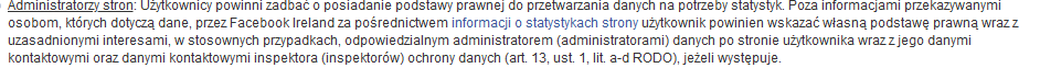 To dlatego Trybunał uznał, że właściciel strony internetowej wspólnie z Facebookiem ponosi odpowiedzialność za przetwarzanie danych w zakresie gromadzenia ich przez wtyczki społecznościowe. A co za tym idzie: musi przestrzegać przepisów RODO. Facebook, aktualizując swój załącznik do statystyk stron – i wysyłając maila z informacją, że to zrobił – przypominał o tym obowiązku administratorom fanpage’ów.