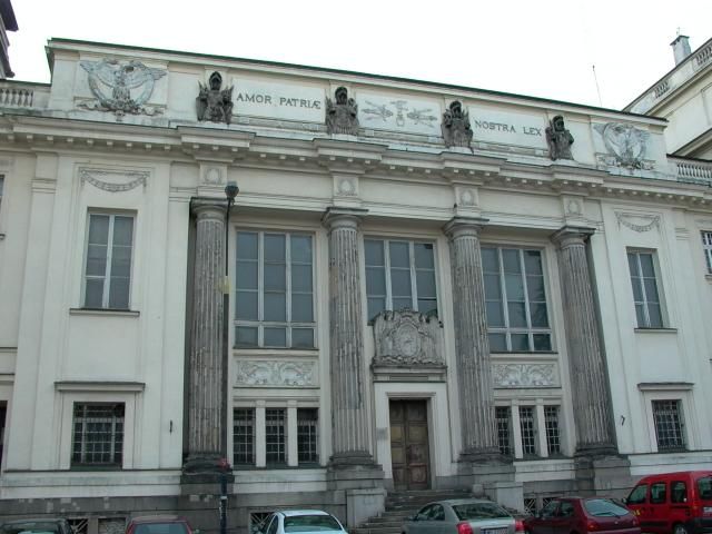 Stojący przy niewielkiej uliczce Okólnik gmach z monumentalną fasadą wygląda jak przeniesiony z Paryża. Na froncie prężą się cztery toskańskie kolumny. Nad drzwiami para aniołów dźwiga kartusz z herbem rodu Krasińskich - Ślepowron. Wyżej: olbrzymie okna, wyrzeźbione w kamieniu zbroje i orły w laurowych wieńcach. Attykę na szczycie zdobi łacińska maksyma: "Miłość ojczyzny naszym prawem".