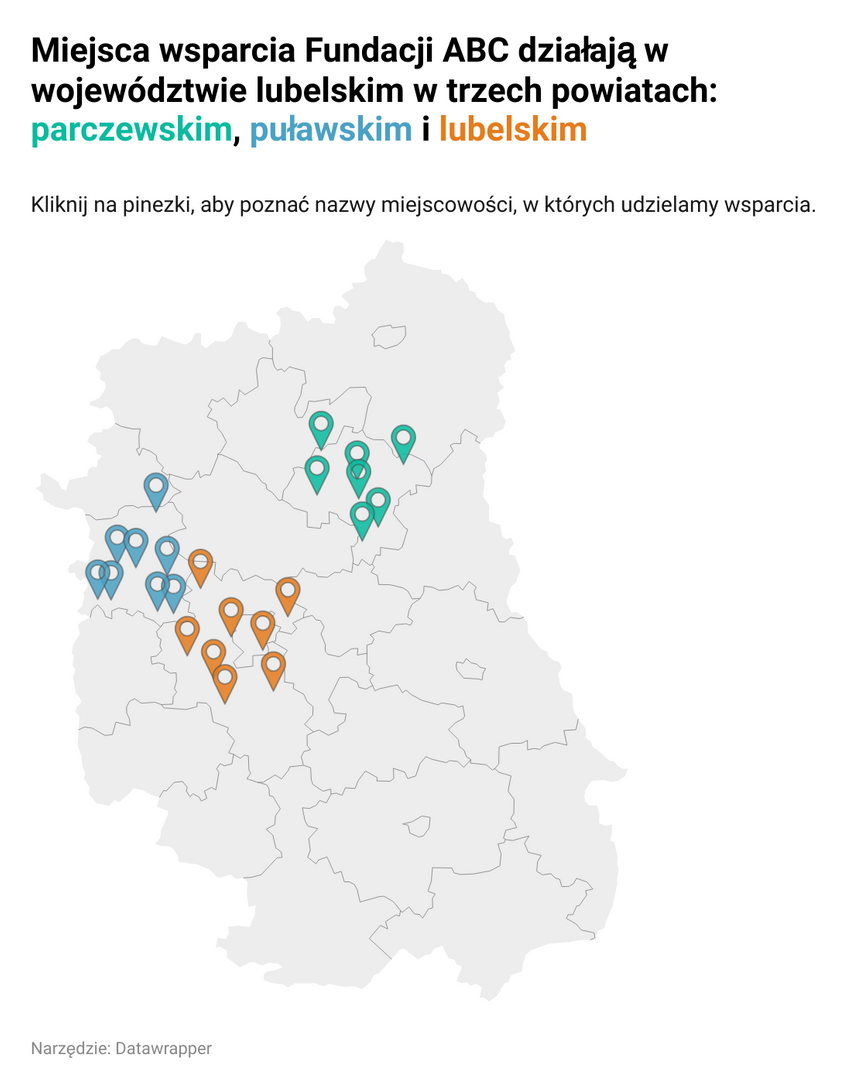 Mapa nr 2: Ośrodki wsparcia Fundacji ABC w województwie lubelskim