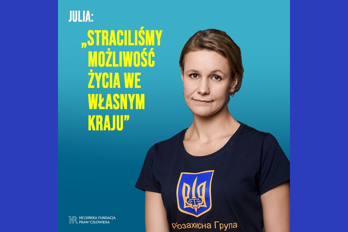 Julia działa społecznie już od 1996 roku. Wtedy zaczęła pomagać dzieciom ulicy. Organizowała dla nich wsparcie różnego rodzaju. W 2015 roku, po pierwszym ataku na wschodnią Ukrainę, dołączyła do Grupy dla Ochrony Praw Człowieka „Sicz”. Zajmowała się tym co teraz – dokumentowaniem zbrodni wojennych. Grupa przyjmowała ofiary napaści na wschodnią Ukrainę i dokumentowała naruszenia praw człowieka. Obecnie pracuje m.in. z byłymi jeńcami wojennymi, cywilami branymi na zakładników oraz ludźmi doświadczonymi przez tortury. Pomaga w kwestiach prawnych i na podstawie ich świadectw składa skargi do Europejskiego Trybunału Praw Człowieka.
