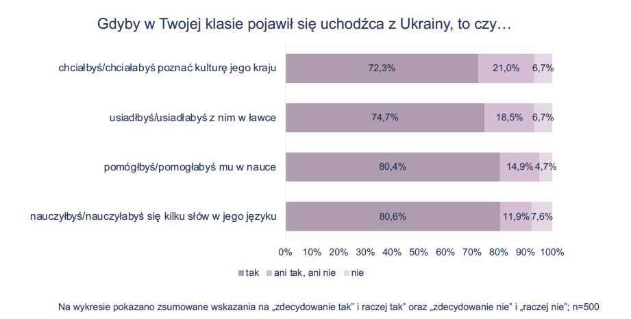 - 3/4 badanej młodzieży chętnie usiądzie w ławce z uczniem uchodźczym, zaś 72 proc. chciałoby zaznajomić się z ukraińską kulturą