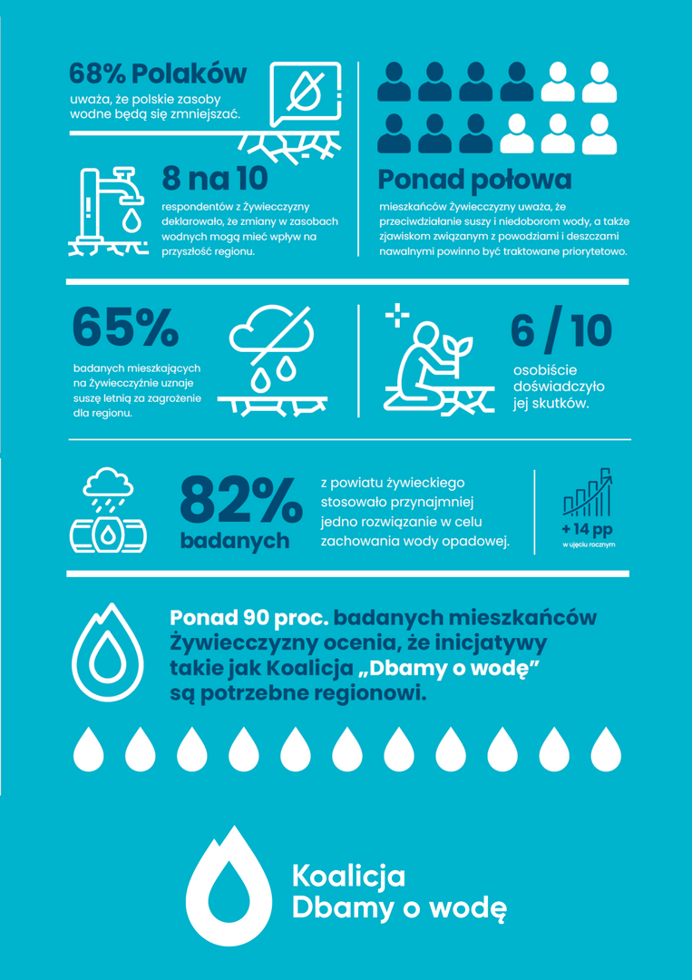 Koalicja „Dbamy o wodę” już po raz trzeci zleciła badania dotyczące postrzegania zasobów wodnych i po raz pierwszy porównała odpowiedzi mieszkańców Żywiecczyzny z opiniami mieszkańców innych regionów Polski. Z badania zrealizowanego przez SW Research wynika, że Polacy mają świadomość tego, iż w przyszłości zasoby wody będą się kurczyć (68% odpowiedzi), a już teraz 41% pytanych uważa, że jest ich za mało.