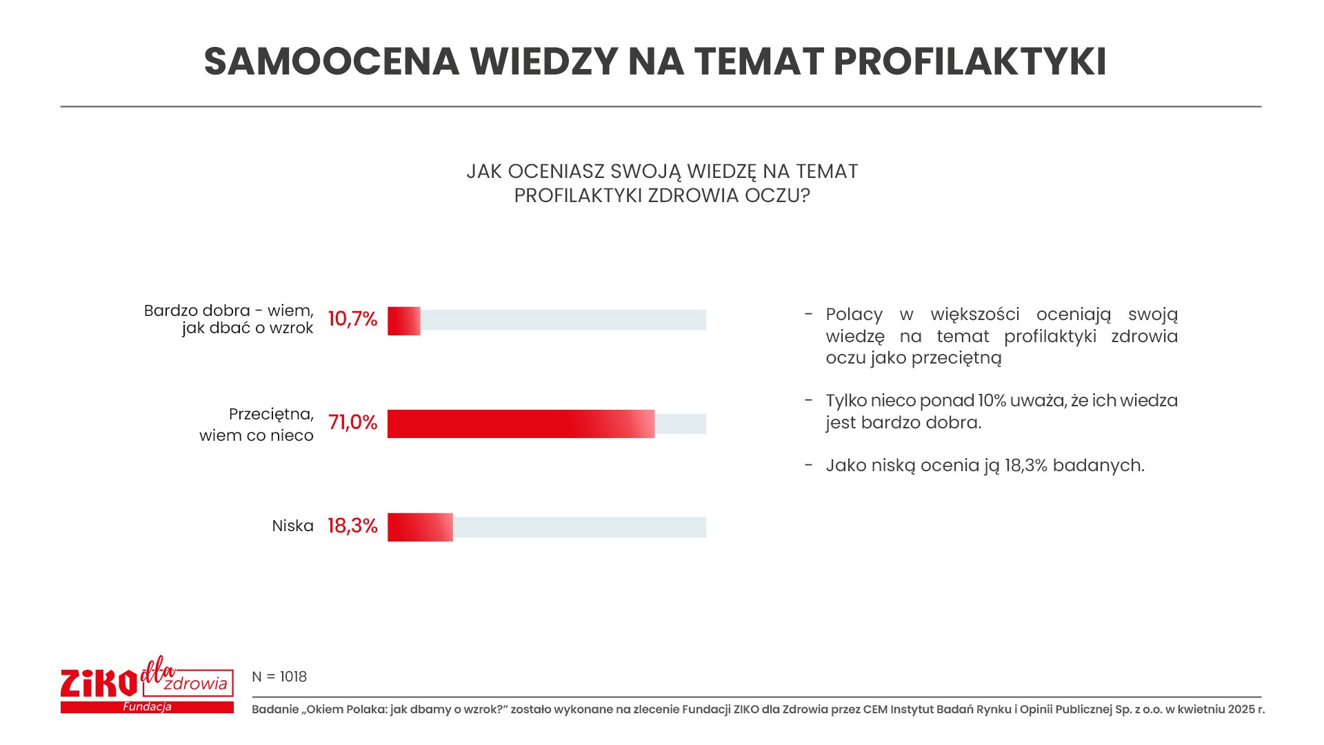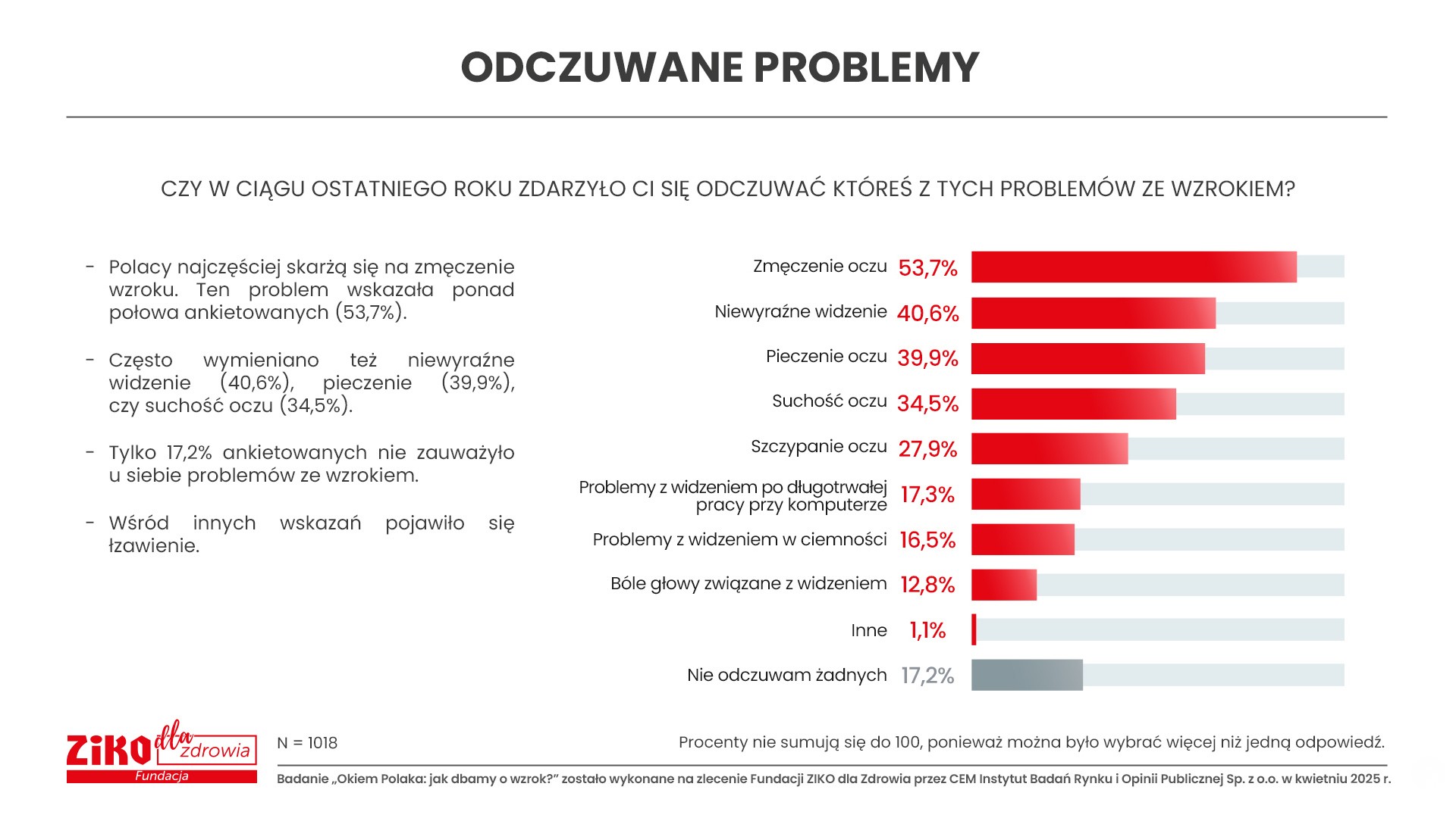 Raport „Okiem Polaka” pokazuje, że problemy ze wzrokiem są powszechne i dotyczą wszystkich grup wiekowych. Jednocześnie wyniki wskazują, że świadomość potrzeby regularnych badań nie przekłada się na codzienne praktyki - wiele osób ignoruje pierwsze objawy i nie korzysta z dostępnych możliwości diagnostyki.