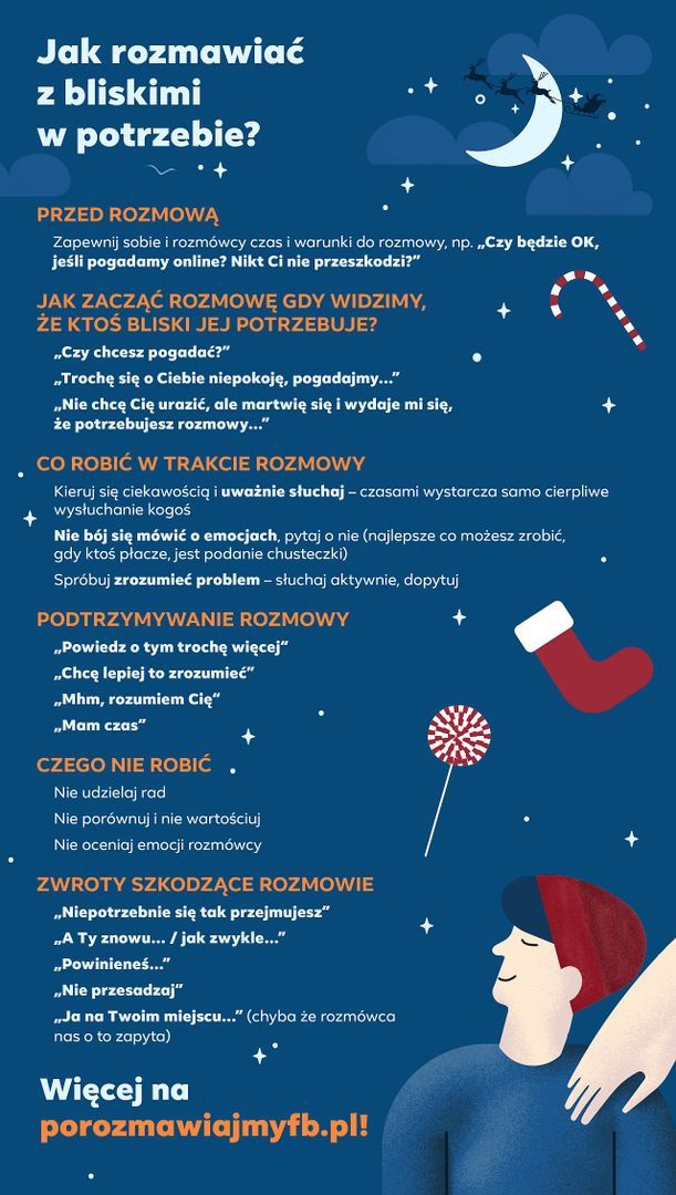 Bez względu na to czy ostatnie tygodnie 2020 roku spędzimy jedynie w najbliższym gronie rodziny, czy z przyjaciółmi na wideokonferencjach, przewodnik stworzony przez Fundację Dajemy Dzieciom Siłę Fundację eFkropka i Facebooka w ramach kampanii #Porozmawiajmy może nam pomóc w tej wyjątkowej sytuacji.