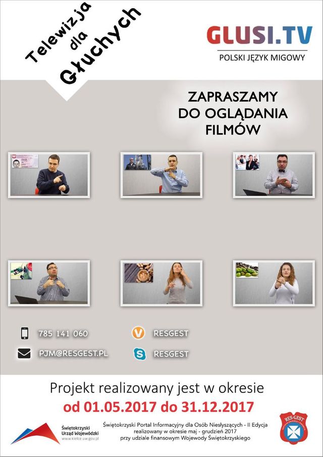Centrum Edukacji i Wsparcia RES-GEST w Rzeszowie w okresie od 1 maja 2017 do 31 grudnia 2017 realizuje projekt dotyczący udostępniania informacji osobom niesłyszącym poprzez Świętokrzyski Portal Informacyjny dla Osób Niesłyszących.