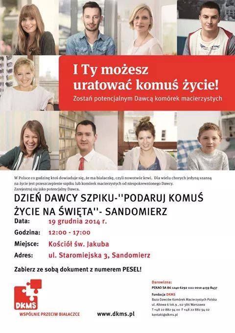 12:00 - 18:00 Dzień Dawcy Szpiku "Podaruj Komuś Życie na Święta" (zorganizowany z zaprzyjaźnioną Fundacją DKMS Polska) a obsługiwane przez szóstkę skazanych z OZ Chmielów tj. Roberta, Krzysztofa, Henryka, Rafała, Michała i Roberta pod czujnym okiem kolejnego gościa warsztatów Pana kapitana Jarosława Babiaka (bez którego trudno sandomierskim Dominikanom wyobrazić sobie tą współpracę);
