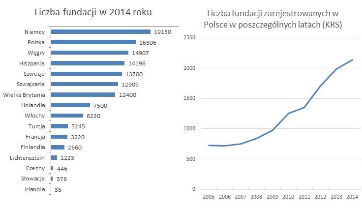 W całej Europie jest ponad 140 tysięcy fundacji, które rocznie na rzecz pożytku publicznego przekazują 55 miliardów euro. Obecnie w Polsce jest zarejestrowanych ponad 18 tysięcy fundacji. Z roku na rok powstaje ich coraz więcej – w roku 2005 zarejestrowano 729 fundacji, a w 2014 niemal trzy razy więcej – 2142. Pod względem liczby fundacji zajmujemy drugie miejsce (zaraz za Niemcami) wśród 15 krajów europejskich (patrz wykres).