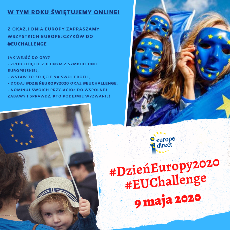 Z kolei Polska Fundacja im. Roberta Schumana, aby uczcić 70-lecie wygłoszenia przez jej patrona deklaracji, która zmieniła oblicze Europy, zachęca wszystkich do wywieszenia unijnych flag w oknach i na balkonach w dniu 9 maja. Nie masz takiej flagi? Pobierz ją z wydarzenia i wydrukuj! Możesz też zrobić jej zdjęcie, wrzucić do mediów społecznościowych i oznaczyć hasztagiem #OknoDlaEuropy.Polska sieć Punktów Informacji Europejskiej Europe Direct przygotowała z kolei ogólnokrajowy konkurs #EUChallenge. Jego celem jest pokazanie, że mimo zalecanego dystansu społecznego w codziennym życiu, bez przeszkód jesteśmy w stanie razem uczcić Dzień Europy w 2020 r. Zadaniem konkursowym jest zrobienie sobie lub innym kreatywnego zdjęcia z symbolem/ami związanymi z Unią Europejską oraz wrzucenie go na swój profil na Facebooku z hashtagami #EUChallenge oraz #DzieńEuropy2020. Punkty Europe Direct zachęcają także do oznaczania swoich znajomych, aby również wzięli udział w zabawie. Dla mniej kreatywnych przygotowana także została specjalna nakładka na zdjęcie profilowe.