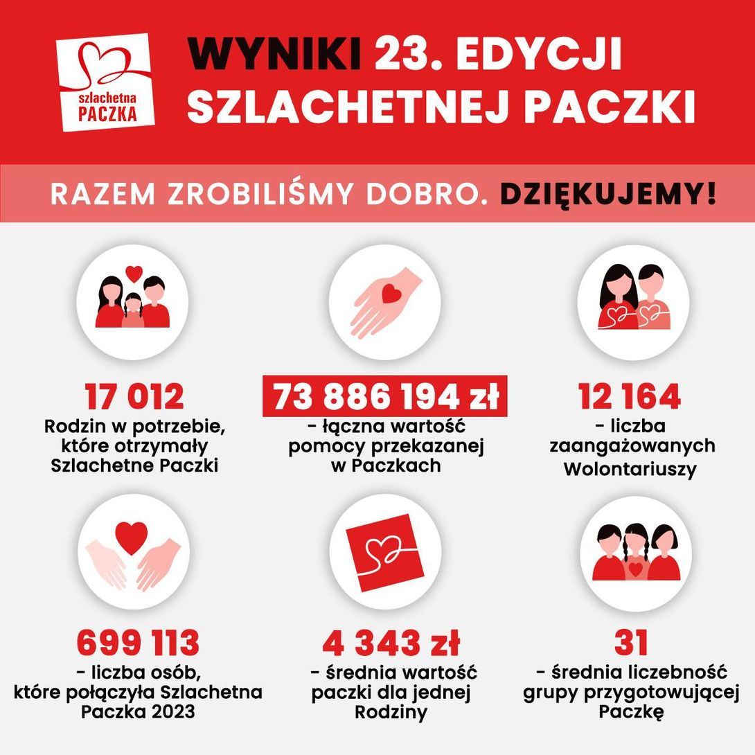 Podczas tegorocznej edycji Szlachetnej Paczki pomoc dotarła do ponad 17 tysięcy rodzin z najdalszych zakątków Polski. Wartość pomocy – przekazanej w paczkach – w tym roku jest rekordowa i wyniosła niemal 74 mln. To o 14 mln więcej niż w 2022 roku. Pomimo trudnej sytuacji ekonomicznej Polacy pokazali, że „razem stać nas na dobro” dla tych, którzy mają najmniej.