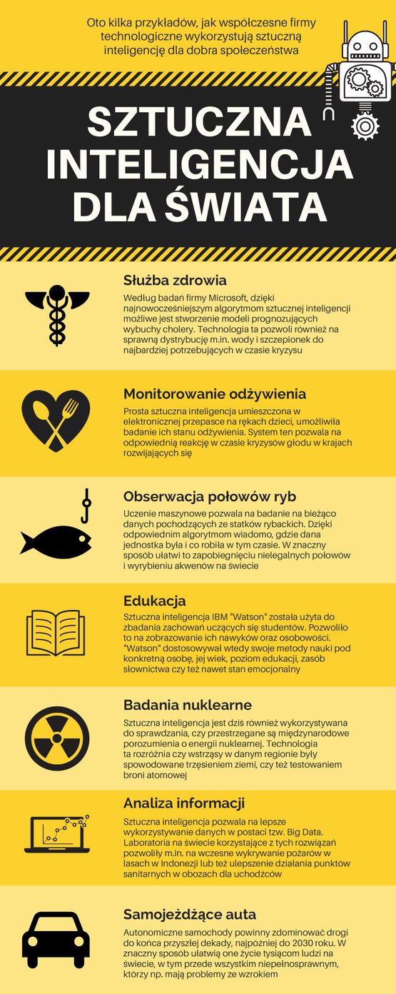 W czasie konferencji pojawiła się również okazja do zaprezentowania istniejących już projektów, które korzystają z dobrodziejstw nowej technologii do poprawy sytuacji na świecie. Na naszej infografice możecie się Państwo zapoznać z kilkoma przykładami. Z pewnością są one inspirujące i pozwalają spojrzeć na temat sztucznej inteligencji z zupełnie nowej perspektywy.