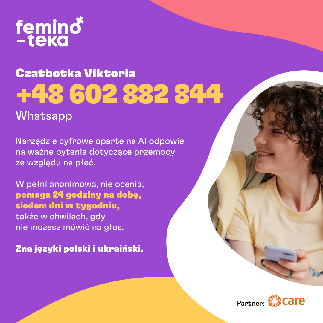 Czatbotka Viktoria to kanał cyfrowy działający w aplikacji WhatsApp pod numerem +48 602 882 844. Zapewnia nowoczesny, bezpieczny i natychmiastowy dostęp do rzetelnych informacji o przemocy ze względu na płeć, w tym jak skorzystać z usług pomocowych, takich jak infolinie i bezpieczne przestrzenie.