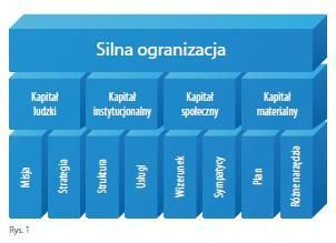 Organizację pozarządową można porównać do krzesła – jeśli mebel posiada cztery nogi, to można na nim bezpiecznie usiąść, jednak jeśli brakuje przynajmniej jednej, to korzystanie z takiego mebla staje się ryzykowne. Podobnie jest z fundacjami i stowarzyszeniami – brak jednego z czterech kapitałów być może nie stanowi przeszkody w działaniu w perspektywie kilku lat, jednak dłuższe funkcjonowanie może być już problematyczne.Cztery fundamenty, na których buduje się stabilną organizację to (por. Rysunek 1):