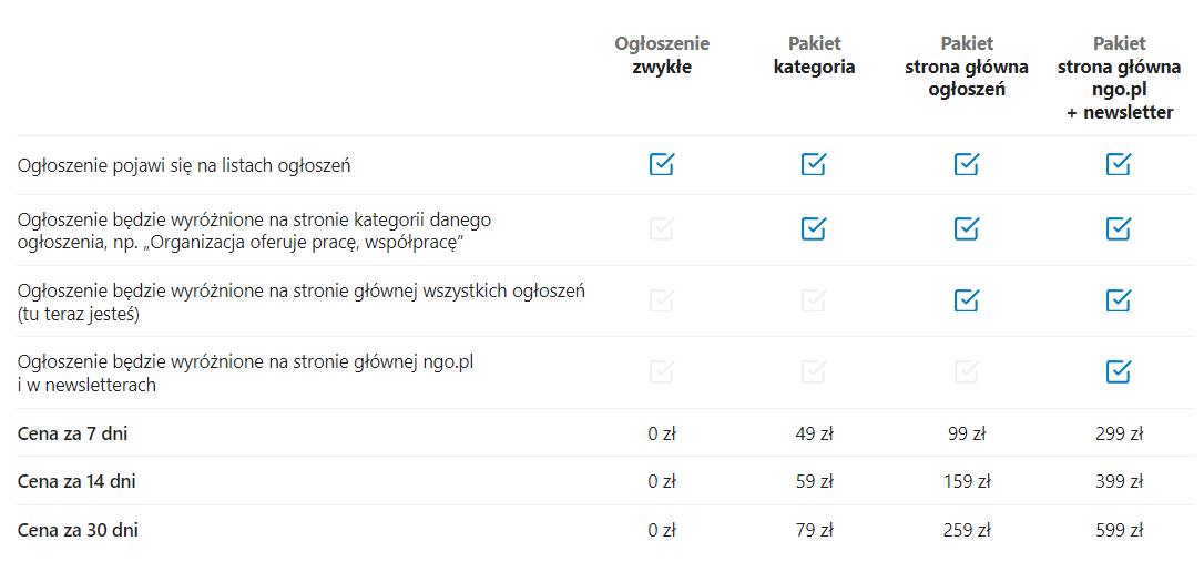 Na czym to polega? Aby zwiększyć widoczność Twojego ogłoszenia, możesz wyróżnić je za opłatą. Cennik pakietów znajdziesz poniżej (dostępny też na stronie głównej ogloszenia.ngo.pl).