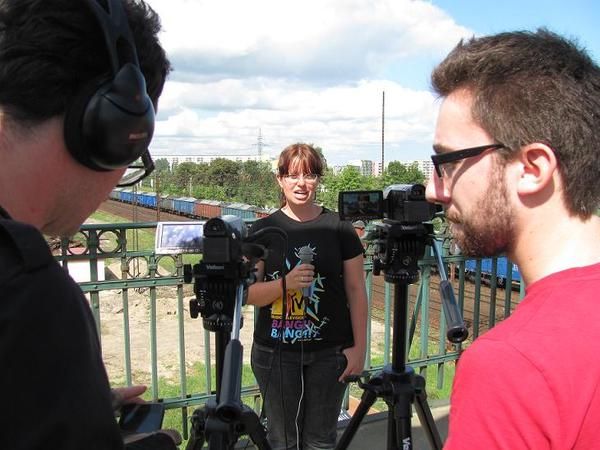 Piękne słońce, pięciu wolontariuszy, dwie kamery, czyli Regionalne Centrum Wolontariatu w Gdańsku na planie zdjęciowym.