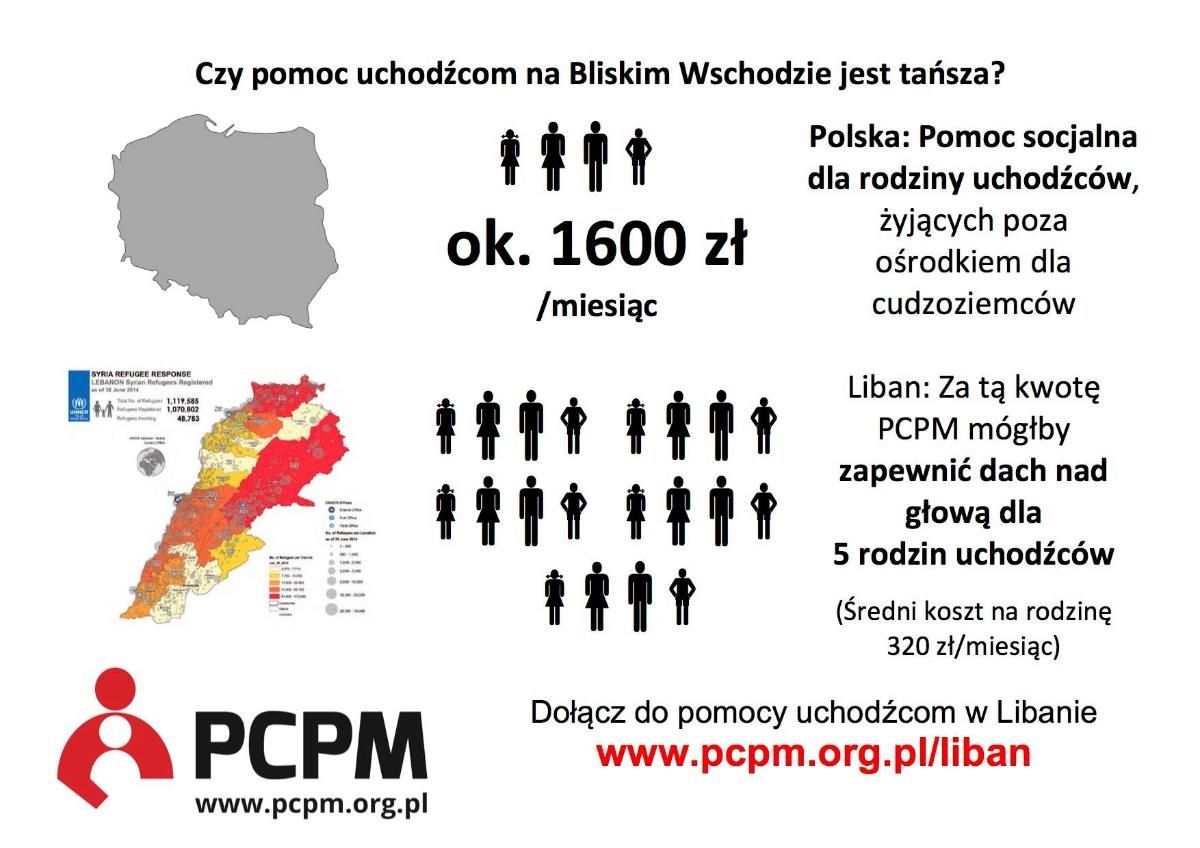 Pomoc dla uchodźców potrzebna jest w Europie ORAZ na Bliskim Wschodzie. Ale ta na Bliskim Wschodzie jest znacznie tańsza. Kwota potrzebna na utrzymanie jednej rodziny uchodźców w Polsce wystarcza na zapewnienie utrzymania pięciu rodzinom w Libanie. Szczegóły w infografice fundacji PCPM.