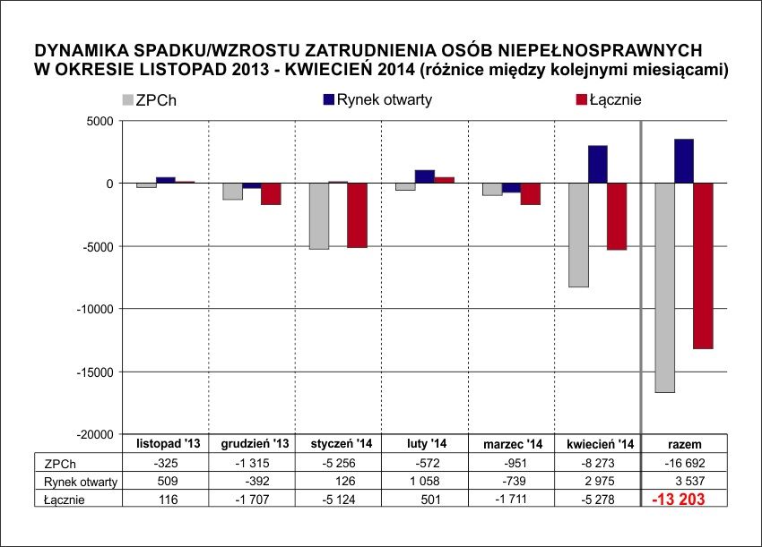 Nowelizacja z 8 listopada 2013 roku zniosła różnicę pomiędzy ZPCh i wszystkimi innymi przedsiębiorstwami i wprowadziła nowe stawki, które od 1 kwietnia 2014 roku wynoszą odpowiednio: 450 zł (1050 zł), 1125 zł (1725 zł) i 1800 zł (2400 zł). Rzut oka wystarczy, by stwierdzić, że sytuacja pracodawców nie prowadzących ZPCh zmieniła się relatywnie niewiele, a w dwóch sytuacjach nawet się poprawiła. Zmiana ich dofinansowania wynosiła odpowiednio: +30 zł (-30 zł), +75 zł (-165 zł) i -90 zł (-570 zł)**. Straciły więc tylko te podmioty, które zatrudniają niepełnosprawnych ze schorzeniem specjalnym, a w przypadku pozostałych część mogła nawet zyskać.