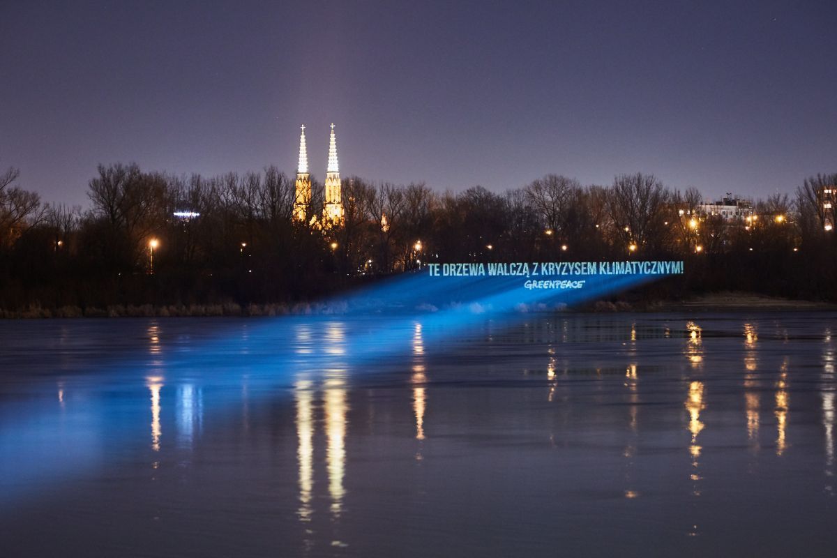 „Te drzewa walczą z kryzysem klimatycznym” – projekcją takiego hasła na drzewa porastające prawy brzeg Wisły w Warszawie aktywiści Greenpeace wezwali prezydenta miasta, Rafała Trzaskowskiego do tego, by rzeczywiście zadbał o dziką przyrodę w mieście i zmienił podejście do planowanej nad Wisłą wycinki niszczącej cenne przyrodniczo tereny.