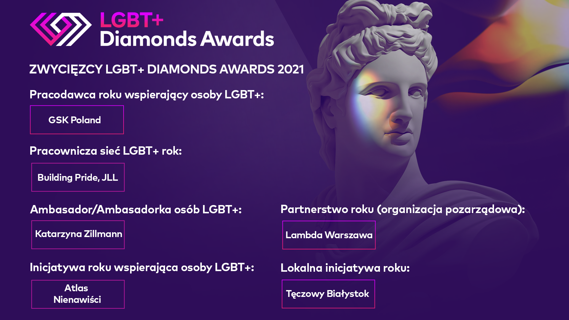Tęczowe sieci pracownicze, warsztaty z języka inkluzywnego, odczarowywanie negatywnego wizerunku miasta czy wspieranie osób w kryzysie — właśnie poznaliśmy zwycięzców_czynie tegorocznych nagród LGBT+ Diamonds Awards 2021. To nagrody, które otrzymują firmy, osoby indywidualne i organizacje za wsparcie osób LGBT+ w Polsce. Wśród nich znajdują się: GSK Poland, Building Pride JLL, olimpijka Katarzyna Zillmann, Atlas Nienawiści, Lambda Warszawa i Tęczowy Białystok.