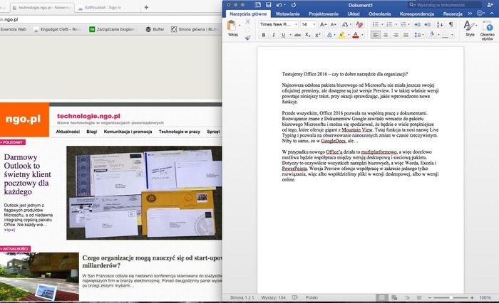 Tym, co zawsze podobało mi się w pakiecie Office, to rozmiar okna Worda. Jak widać na załączonym obrazku, wszystko jest tu bardzo kompaktowe. Znacznie ułatwia to pracę, jeśli jednocześnie korzystamy z innej aplikacji otwartej w tle. Przestanie mieć to znaczenie po aktualizacji Mac OS X do wersji El Captain, gdzie znajdzie się automatycznie dzielenie ekranu, ale do czasu jego premiery Word z pewnością zastąpi mi apple’owskie Pages.