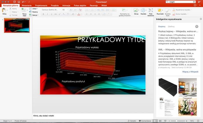 Czym byłby pakiet Office bez PowerPointa! Narzędzie do tworzenia prezentacji zyskało kilka nowych funkcji, chociażby słynne „Insights”, a więc automatycznie wyświetlane definicje oznaczonych słów. Korzystając z silnika wyszukiwarki Bing, program sam znajduje znaczenie danego terminu, pozwalając na wyświetlenie go w postaci okna pop-up, dzięki czemu nie marnujemy miejsca na slajdach. Oprócz tego, standardowo – nowe szablony, rozwiązania wizualne, etc.