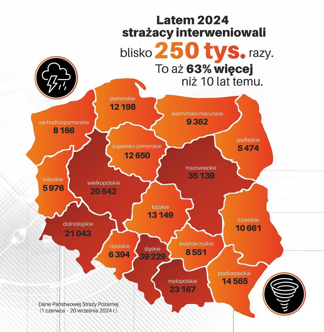 Z danych Państwowej Straży Pożarnej wynika, że tego lata strażacy musieli interweniować blisko 250 tysięcy razy – to średnio nawet ok. 2200 razy każdego dnia i aż o ok. 63 procent więcej niż jeszcze 10 lat temu. Na te wyniki nie miały wpływu tylko powodzie – nie licząc katastrofalnego września było to wciąż o ok. 56 procent interwencji więcej niż w 2014 roku. Z kolei tylko w czasie trwania ekstremalnych powodzi na południu jednego dnia zanotowano ponad 15 000 interwencji.