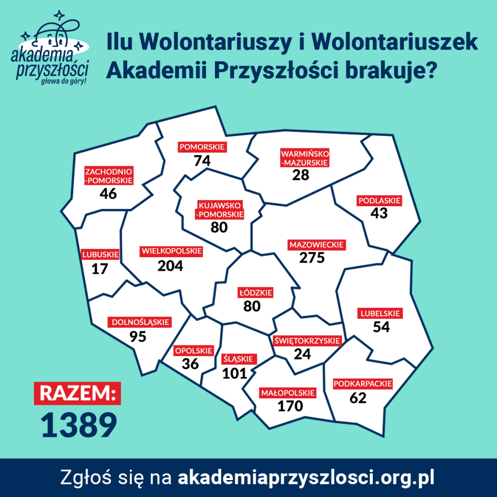Rekrutacja do Akademii Przyszłości dobiega końca, ale wciąż czekamy na wielu Wolontariuszy. Każdy wolontariusz lub wolontariuszka to jedno dziecko, które może uwierzyć w siebie. Akademia Przyszłości przeszkoli Cię, wyposaży we wszystkie niezbędne materiały. Wolontariat to nie jest trudne wyzwanie, a w razie czego jesteśmy cały czas dla wolontariuszy i pomagamy. Możesz liczyć na wsparcie zarówno tych osób, które są bardziej doświadczone w Akademii Przyszłości, jak i specjalistów: psychologów i pedagogów