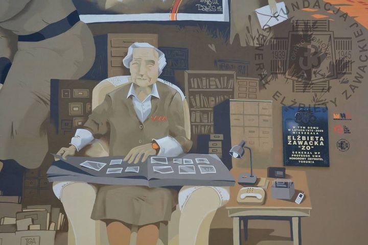 Mural Poświęcony Generał Elżbiecie Zawackiej jedynej kobiecie wśród Cichociemnych, Powstańczyni Warszawskiej, Kurierce i Emisariuszce do Wodza Naczelnego Generała Sikorskiego w Londynie powstał w Toruniu z okazji 25-lecia Fundacji Generał Elżbiety Zawackiej.
