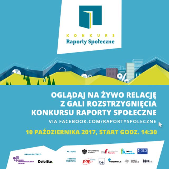 10 października zostaną ogłoszeni laureaci Konkursu Raporty Społeczne, organizowanego przez Forum Odpowiedzialnego Biznesu i firmę Deloitte. Transmisja na żywo z gali będzie odbywać się przez media społecznościowe Forum Odpowiedzialnego Biznesu, w tym profil na kanale Facebook.com/raportyspoleczne.