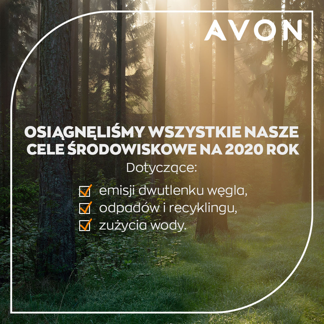 Marka Avon m.in. walczy ze zmianami klimatycznymi, dba o zwierzęta oraz stara się pakować swoje produkty wyłącznie w opakowania wykonane z surowców pozyskanych w zrównoważony sposób. W ubiegłym roku firma zredukowała emisję gazów cieplarnianych o 53%, a dalsze plany zakładają osiągnięcie zerowej emisji do 2030 roku. Avon odpowiedzialnie podchodzi również do produkcji swoich plastikowych opakowań. Już dziś poziom ich przetwarzania osiągnął ponad 93%, a do 2025 roku planują osiągnąć poziom 100% w skali globalnej.