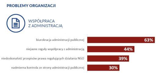 Trzeci w rankingu problemów – „nadmierna biurokracja administracji publicznej” – jest w Warszawie odczuwana przez 63% organizacji, a więc o 7 punktów procentowych więcej niż w całym sektorze. Podobnie „niejasne reguły współpracy organizacji z administracją publiczną” w Warszawie doskwierają 44% organizacji, czyli o 10 punktów procentowych więcej niż w całej Polsce. Organizacje warszawskie częściej narzekają też na niedoskonałość lub brak przepisów regulujących działania organizacji oraz nadmierną kontrolę ze strony administracji publicznej. W porównaniu do stowarzyszeń i fundacji z całego kraju warszawskie organizacje obie te kwestie uznają za problem o 8 punktów procentowych częściej.