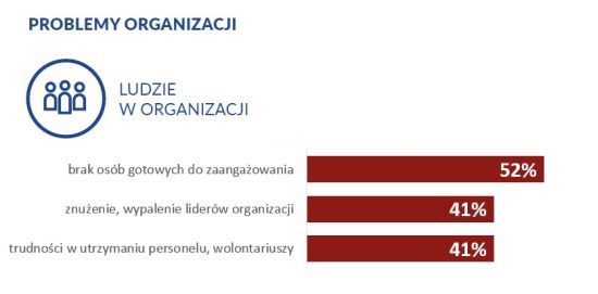 Trudności związane z zespołem organizacji są w stolicy częściej podnoszone niż w całej Polsce. Choć na brak osób gotowych bezinteresownie angażować się w działania organizacji narzeka tyle samo organizacji w Warszawie, co w całej Polsce (52%), to już znużenie liderów organizacji czy trudności w utrzymaniu dobrego personelu i wolontariuszy są bardziej odczuwalne w Warszawie. W stolicy po 41% organizacji widzi problem w każdej z tych kwestii, podczas gdy w całej Polsce jest to odpowiednio 36% i 37% organizacji.