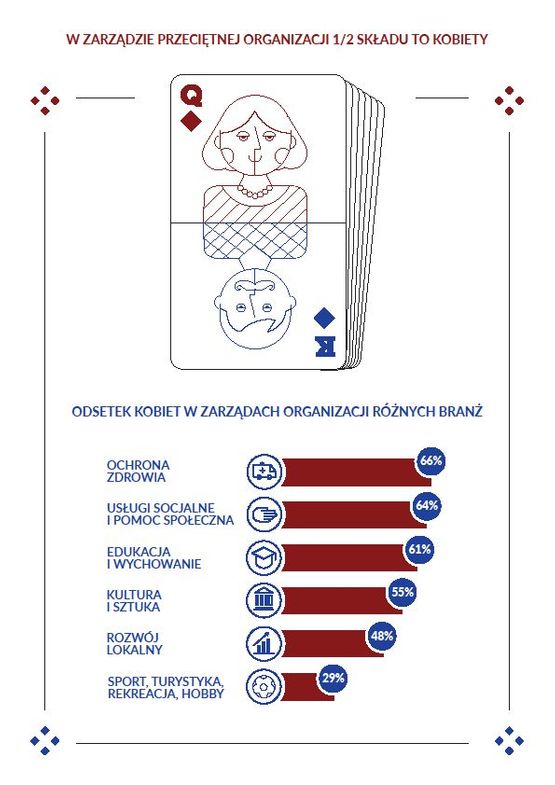 W przeciętnej organizacji kobiety stanowią 47% składu zarządu. Różni się on jednak wyraźnie w zależności od branży, w jakiej działa dane stowarzyszenie lub fundacja.