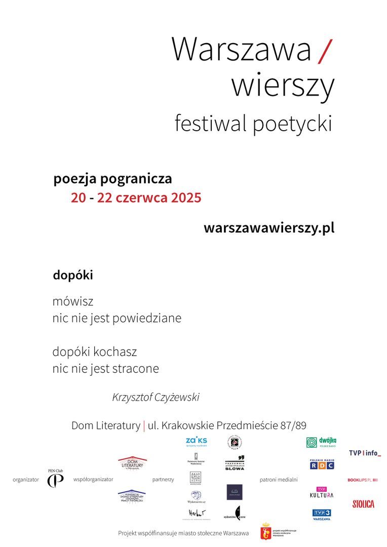 Wyjątkowo w czerwcu odbędzie się tegoroczny festiwal poetycki Warszawa Wierszy – potrwa od 20 do 22 czerwca 2025 roku. To trzecia edycja wydarzenia, które stwarza wyjątkową przestrzeń dla miłośników poezji w sercu stolicy. W programie znalazły się rozmowy o poezji, wieczory poetyckie, wystawy, warsztaty, koncert oraz akcje „Alfabety” i „Podaruj wiersz”. Festiwal organizowany jest przez Polski PEN Club.
