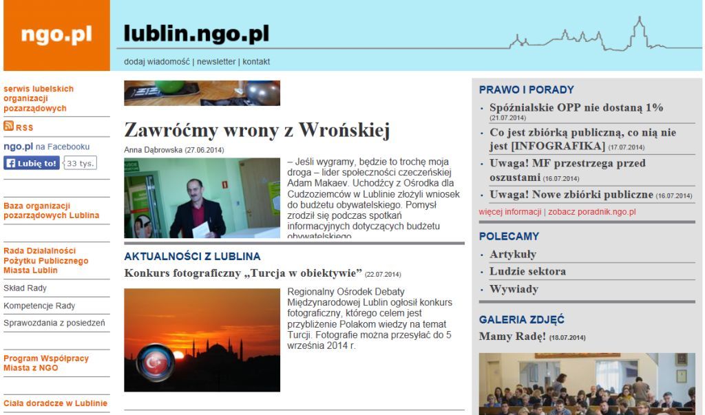 Wystartował serwis lublin.ngo.pl. To trzecie po Warszawie i Wrocławiu miejskie wydanie ngo.pl. „Skupiamy się głównie na działaniach lokalnych, chcemy żeby nasz serwis był przyjazny również dla małych organizacji i grup nieformalnych z Lublina” – mówi Mateusz Małyska, koordynator portalu.
