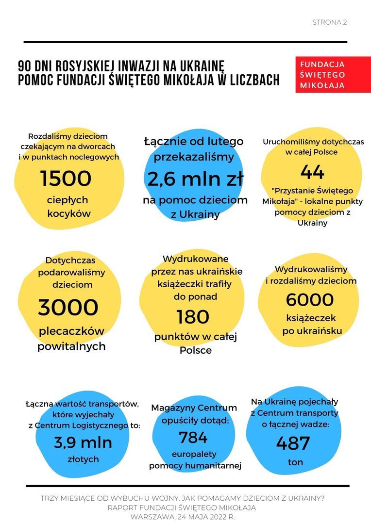 Łącznie od lutego Fundacja Świętego Mikołaja przekazała 2,6 mln złotych na wsparcie dzieci z Ukrainy, a łączna wartość transportów pomocy humanitarnej, które wyjechały z prowadzonego przez Fundację we współpracy z partnerami Centrum Logistycznego to 3,9 mln zł. Fundacja otworzyła także w całej Polsce 44 “Przystanie Świętego Mikołaja”, rozdała dzieciom 1500 ciepłych kocyków i 3000 plecaczków powitalnych, a także wydrukowała 6000 książeczek po Ukraińsku i wysłała je do 180 punktów, w których przebywają dzieci z Ukrainy.