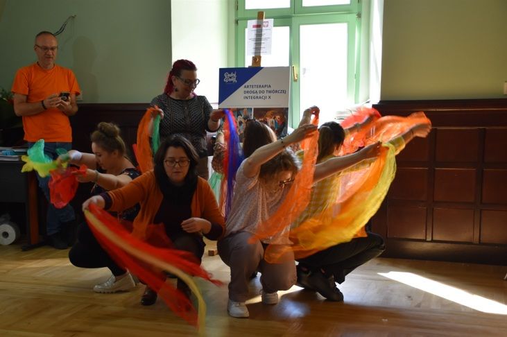 Arteterapia w Fundacji im. Doktora Piotra Janaszka PODAJ DALEJ w Koninie to zajęcia podczas których terapeuci, psycholodzy, asystenci, pedagodzy pracujący z osobami w potrzebie, z osobami z różnymi niepełnosprawnościami, wymieniają się doświadczeniami. Czas ten był pełen ruchu, twórczego eksperymentowania i otwartości, zarówno podczas warsztatów choreoterapii z Martą Berdel, na warsztatach ABC Arteterapii z Iwoną Cichocką, czy na warsztatach dotyczących regeneracji „mięśnia empatii” z Olą Chodasz. Jak podsumowała jedna z uczestniczek te warsztaty to „psychiczne SPA dla mnie :)”