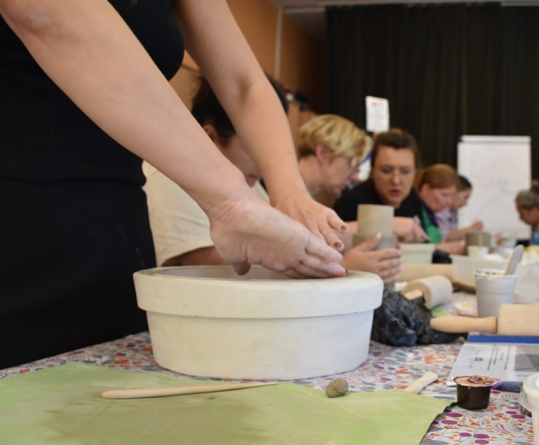 Magdalena Kopiczko, zawodowy ceramik i garncarz, wprowadziła uczestników w świat pracy z gliną podczas warsztatów „Glina – tworzywo na wszystkie zmysły” i „Skulpturoterapia”. Magda skupiła się na glinie jako tworzywie służącym odkrywaniu i ekspresji, podkreślając, że z gliną to nie tylko sztuka – to również „zabawa, relaks, że glina to świetne narzędzie pracy terapeutycznej”. Powstawały prace, w których najważniejszy był sam proces twórczy, uważność i kontakt z materią.