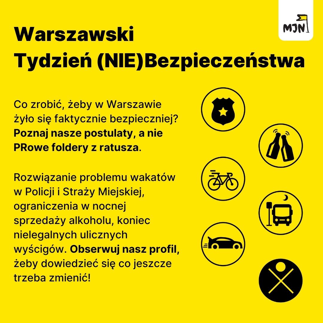 Stowarzyszenie Miasto Jest Nasze rozpoczyna akcję – „Tydzień (Nie)bezpieczeństwa”, która ma na celu zwrócenie uwagi na realne wyzwania związane z bezpieczeństwem mieszkańców Warszawy, w odpowiedzi na niedawno zakończony Miejski Tydzień Bezpieczeństwa zorganizowany przez prezydenta Rafała Trzaskowskiego. W ciągu nadchodzącego tygodnia społecznicy ze stowarzyszenia Miasto Jest Nasze będą codziennie omawiać konkretne problemy związane z bezpieczeństwem w Warszawie, a także prezentować postulaty, które – ich zdaniem – pozwolą skutecznie rozwiązać te kwestie.