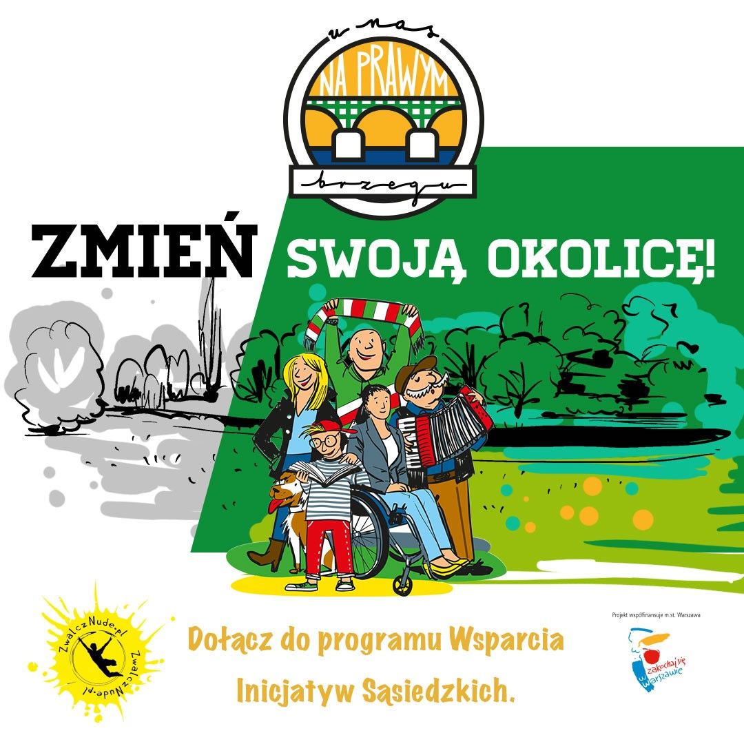 W ramach „U nas – na prawym brzegu” Fundacja Zwalcz Nudę zaplanowała gry miejskie w każdej z dzielnic (pierwsza z nich odbędzie się, gazetę sąsiedzką oraz piknik dla mieszkańców. Właśnie ruszył także Program Wsparcia Inicjatyw Sąsiedzkich, który zapewnia mieszkańcom oraz organizacjom działającym na terenach objętych projektem pomoc w realizacji ich przedsięwzięć. Aby zgłosić się do Programu Wsparcia Inicjatyw Sąsiedzkich, wystarczy pomysł na działanie wpływające na okolicę. Wspólne sprzątanie podwórka, integracja sąsiedzka, pomoc okolicznym mieszkańcom przed zbliżającą się zimą i Bożym Narodzeniem, a może cykliczne spotkania rodziców z małymi dziećmi? Fundacja zapewni wsparcie merytoryczne, finansowe oraz logistyczne – aby zgłosić inicjatywę, należy wypełnić formularz zgłoszeniowy na stronie internetowej: www.zwalcznude.pl/u-nas-na-prawym-brzegu/program-wsparcia-inicjatyw-sasiedzkich.