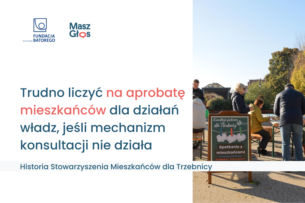 Poza kilkoma sytuacjami, gdy władze samorządowe muszą zorganizować konsultacje społeczne, nie jest to mechanizm obowiązkowy, ale dobra praktyka. W Trzebnicy władze nie pytają mieszkańców o zdanie przy okazji np. planów inwestycyjnych miasta, choć ich decyzje wpływają na życie całej społeczności. Na sytuację zareagowało Stowarzyszenie Mieszkańców dla Trzebnicy, a historia znalazła się w „Atlasie dobrych praktyk” akcji Masz Głos Fundacji Batorego.