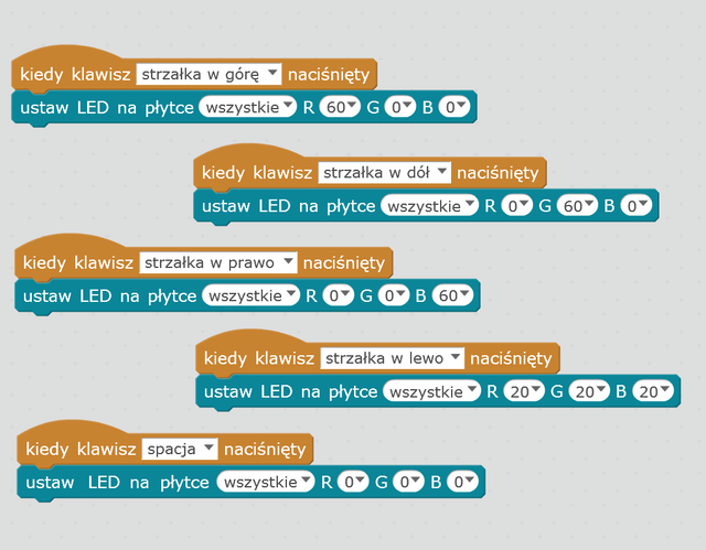 Podobnie jak w poprzednim zadaniu, można tak zaprogramować robota, aby po naciśnięciu danego klawisza zapalały się światełka (diody LED) w wybranym przez nas kolorze. Tu korzystamy z bloczka „ustaw LED na płytce… R… G… B…”. Z rozwijanej listy można wybrać „wszystkie” (wówczas zaświecą się dwie diody zamocowane na „grzbiecie” robota), albo „lewy LED” lub „prawy LED” (wówczas w danym kolorze zaświeci się wybrana dioda). Kolory ustawiamy wybierając wartość spośród zaproponowanych na rozwijanej liście (np. 60) albo wpisując własną liczbę. Gdy wstawimy wartość tylko w polu „R”, kolor będzie czerwony, w polu „G” – zielony, w polu „B – niebieski, a od wartości zależeć będzie jasność koloru. Różne kolory i odcienie możemy uzyskać dobierając różne wartości dla danych pól.