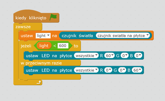A teraz stworzymy skrypt, który sprawi, że po oświetleniu latarką mBot zmieni kolor światła diody z niebieskiego na czerwony. Żółta pętla „zawsze” oznacza, że robot nieustannie powtarza nakazaną mu czynność, a więc w tym przypadku sprawdza bez przerwy, ile światła jest w pomieszczeniu i w zależności od wyniku, wykonuje jedno z dwóch działań: włącza (bez przerwy) diodę czerwoną albo niebieską. Z kolei, instrukcja warunkowa „jeżeli…, to…, w przeciwnym razie…” (z żółtej kategorii „Kontrola”) pokazuje, co robot ma wykonać, jeśli nastąpi taki, albo inny warunek. Jeśli zmierzone natężenie światła w pomieszczeniu wynosiło 500, możemy wybrać – jako warunek – liczbę trochę większą (np. 600), po której przekroczeniu robot powinien zareagować, tzn. zmienić kolor diody. Warunek ten nastąpi, gdy skierujemy na robota strumień światła z latarki.